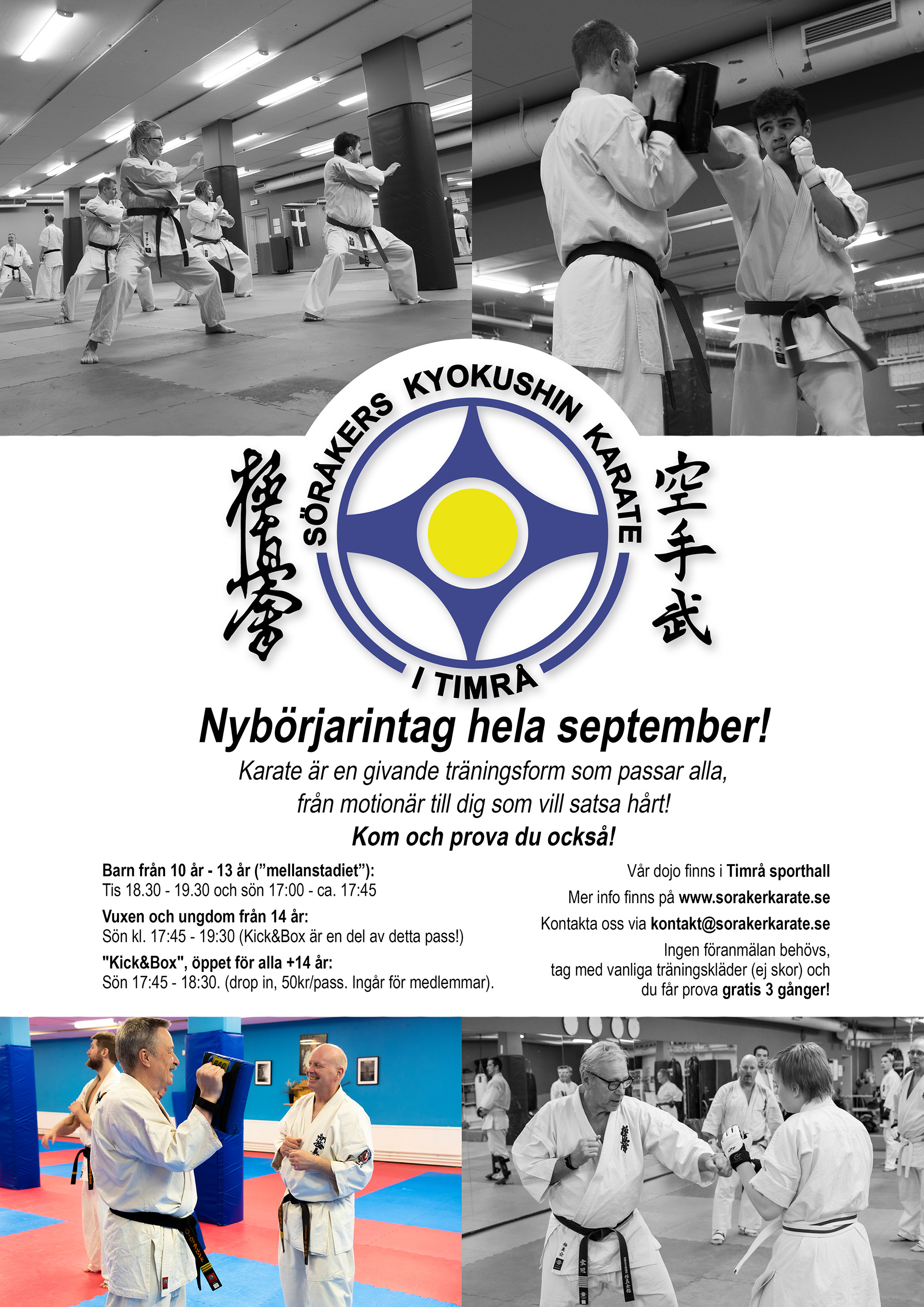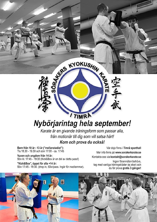 Barnen börjar som vanligt kl 17.00 och tränar till 17.45! Därefter kommer ett "Kick&Box/fys" pass som är öppet för avancerade, lite äldre barn från barngruppen, som vill svettas extra. Detta passet är också en del av vuxen/ungdomspasset. Kick&Box pågår mellan 17.45 - 18.30. Därefter fortsätter vuxen/ungdom med kihon/kata fram till ca. kl 19.30.